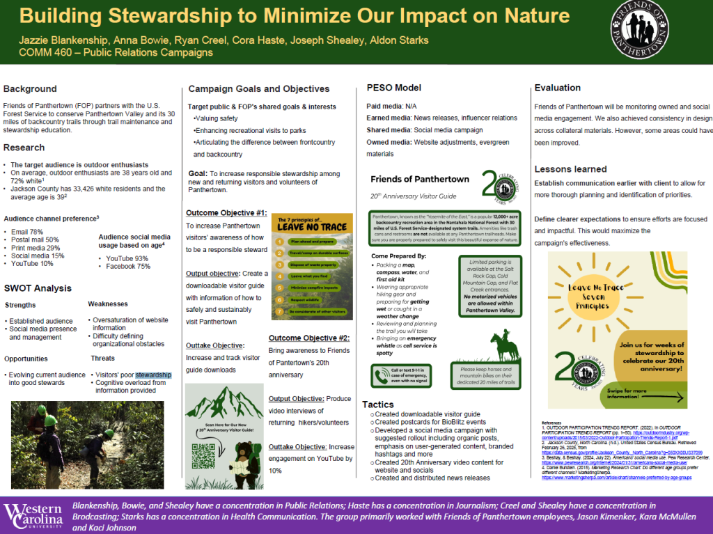Welcome to my digital portfolio! Here, you will find a collection of service learning projects, internship work, and committee tasks I’ve done during my time at Western Carolina University. Throughout these experiences, I have furthered my skills of effective communication strategies, campaign structure, AP style writing, and event planning–with campaign structure being one of my strengths!